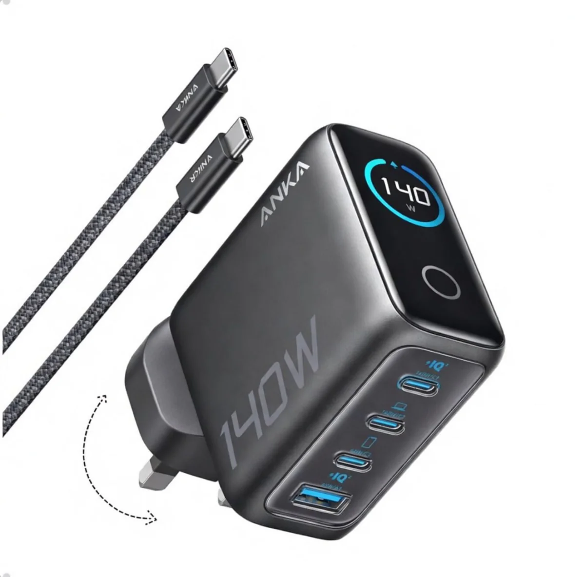 شاحن جداري سريع ANKA 140W بتقنية GAN، 4 منافذ (3 TYPE-C + 1 USB-A)، شاشة عرض رقمية، حماية أمان 24 ساعة، شحن 4 أجهزة في آن واحد، متوافق مع آيفون، لابتوب، أجهزة ذكية